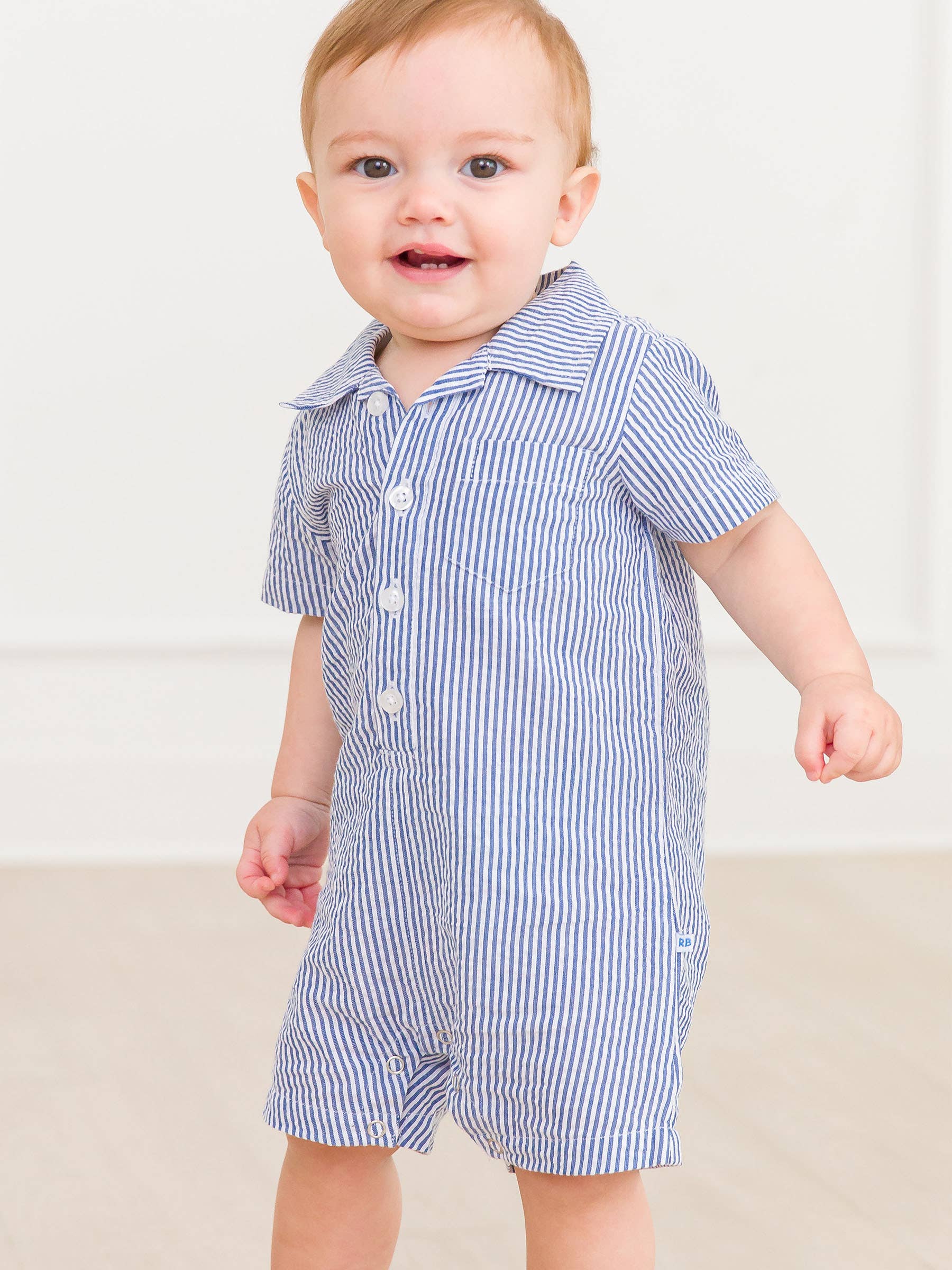 Your little guy will rock this romper one piece! Easy to throw on and wear to the playground or for picture day, this romper is such an easy outfit option. Features snaps at the bottom for easy changing.